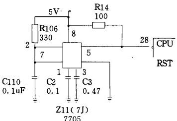 由于機器工作一段時間后,元器件的性能發生變化,導致產生的復位脈沖不符合要求(正常復位脈沖約十幾ns)重新調整復位電路中的電容C后,機器工作正常。如Z? 、TL7705 集成塊損壞,在購不到的情況下,亦可直接用如圖2的一個積分電路 r= RC>12ns 代替。